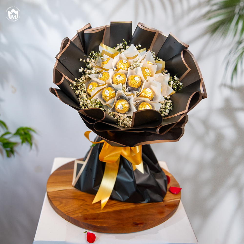 Experience the ultimate fusion of luxury and indulgence. This sophisticated arrangement features 12 premium Ferrero Rocher truffles, nestled in delicate white tissue and accented with ethereal Baby’s Breath. Wrapped in dramatic, matte-black architectural paper with a gold-bordered trim, this bouquet is finished with a vibrant satin yellow ribbon. It’s more than a gift; it’s a statement of elegance.