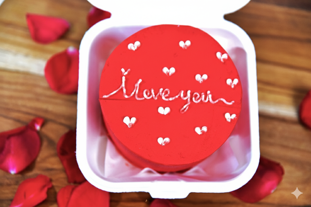 Small in size, big on sentiment. Our signature deep-red bento cake features a velvety finish, hand-piped with a delicate “I love you” script and dainty white hearts. Perfectly portioned for two (or a very indulgent one), it’s the ultimate edible love letter.